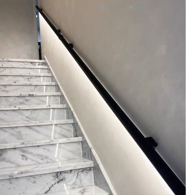 Wall-Mounted: The handrail is securely mounted on brackets attached to the wall, which allows the wiring for the LED lights to be concealed for a seamless look.