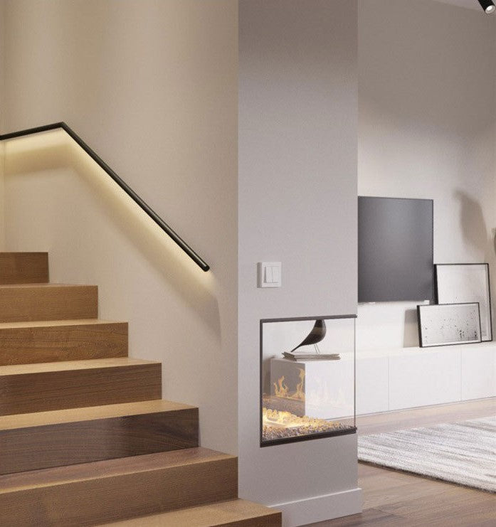 Black aluminium handrail with integrated LED lighting, mounted on a wall. The LED strip runs along the underside of the handrail, casting an even, soft glow onto the wall below. This type of lighting provides both functional illumination for stairs or walkways and an ambient effect that enhances the modern aesthetic of the space.